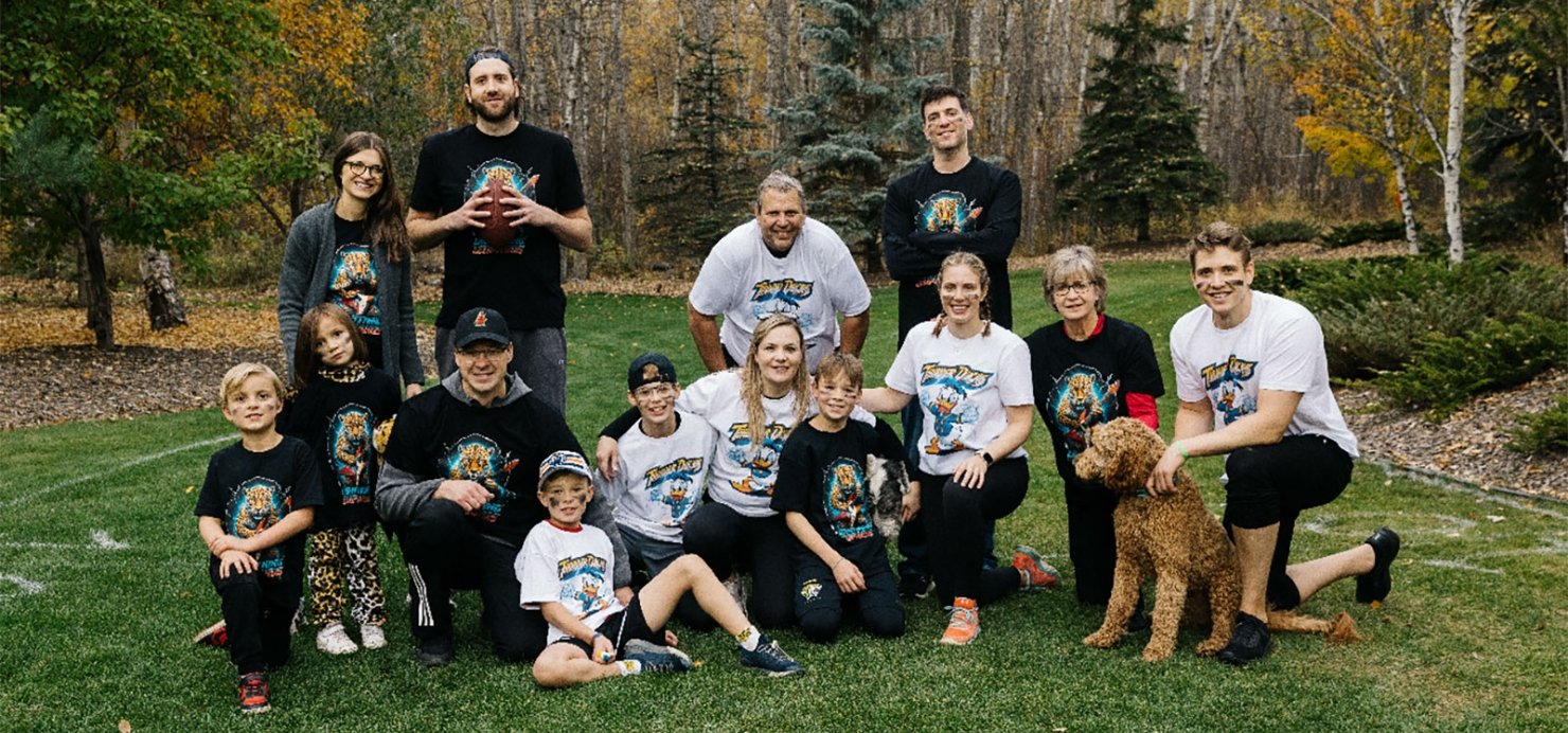 The entire Scragg family smiles for a picture during a game of football.